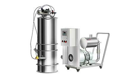 1、真空泵通過真空輸送設(shè)備的分離容器產(chǎn)生真空。將物料從進(jìn)料口通過吸料軟管與吸料口吸入。